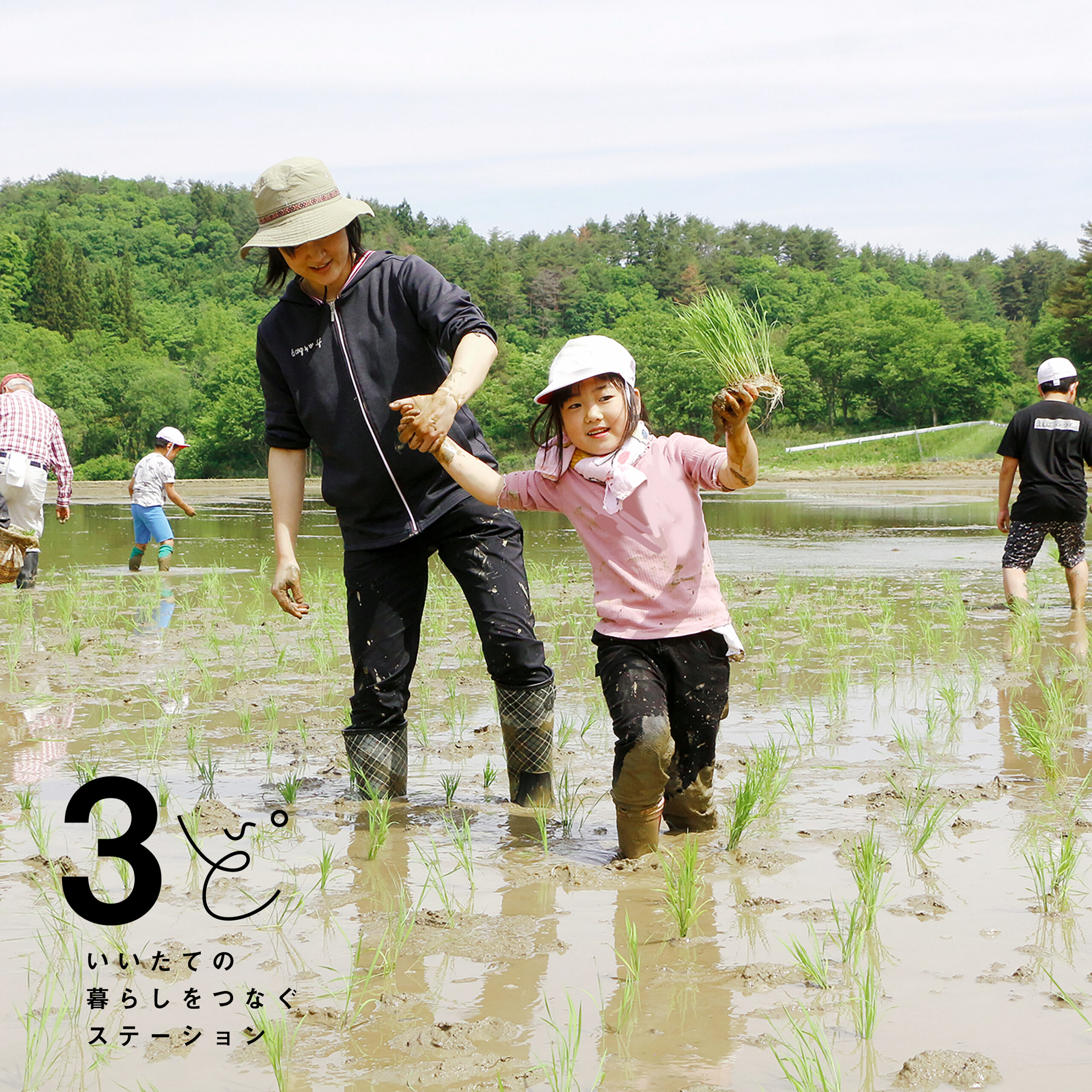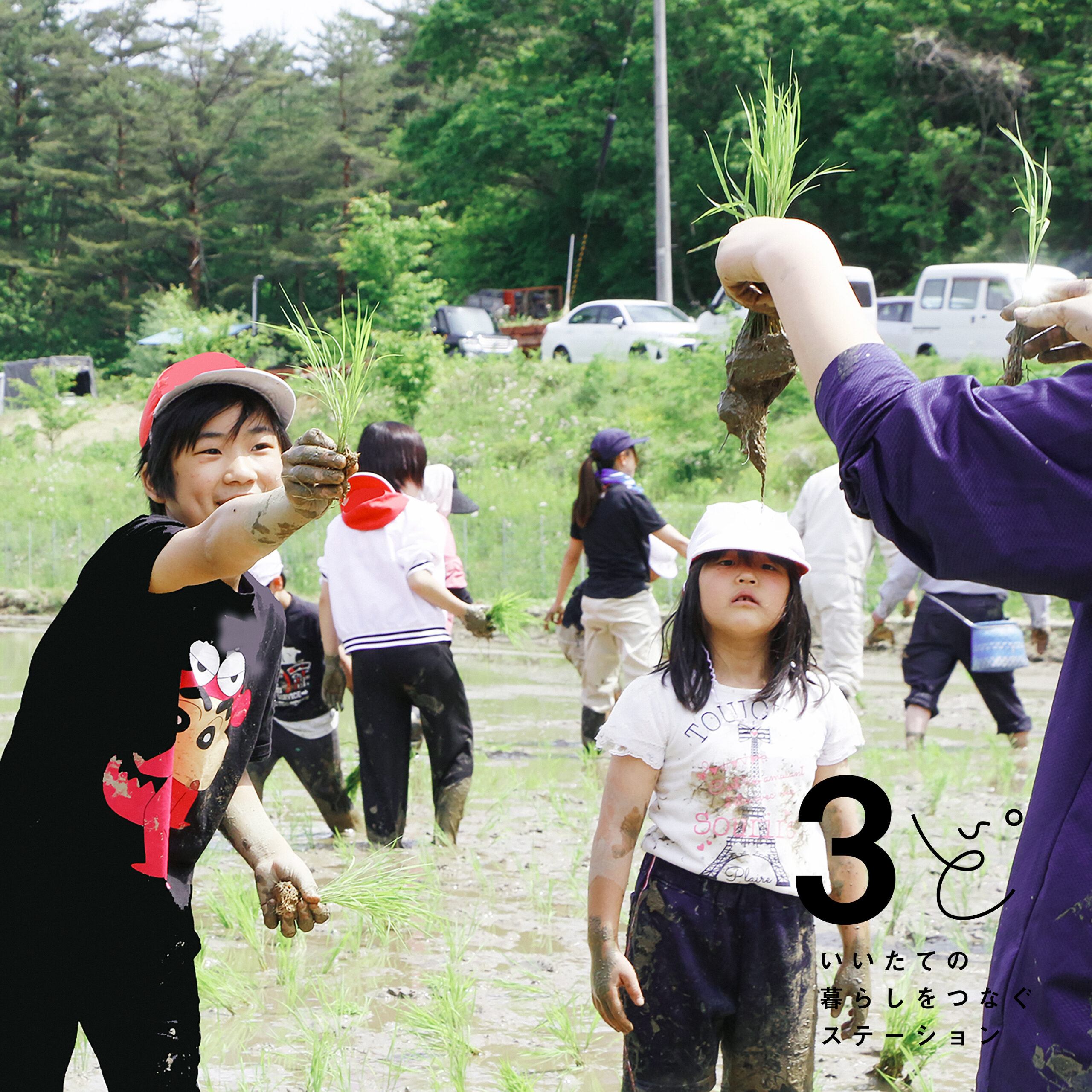 泥がポチポチ付いてる笑顔、まぶしいね。「いいたて希望の里学園」前期課程の子どもたちが、飯樋地区の水田で、田植え体験です。学年をミックスした縦割り班で、上級生が下級生をそっとサポートします。声を掛け合いながら、ていねいに、やさしく苗を植えていきました。
