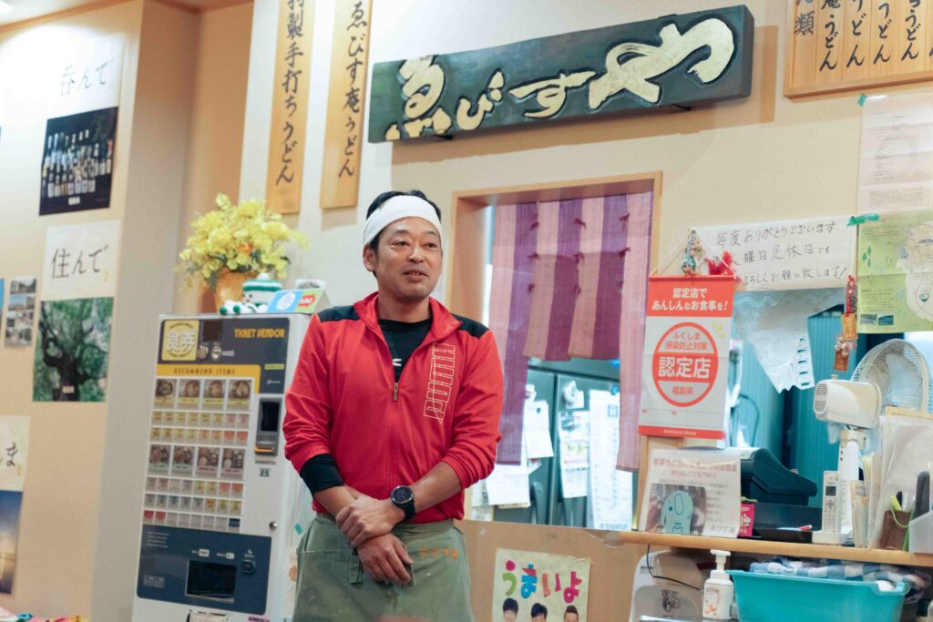夕食の会場は、震災前からの老舗で村内の飲食店では避難解除後真っ先に再開した手打ちうどんの店『ゑびす庵』です。煮魚など素朴な家庭料理と出汁がしみじみ味わい深い手打ちの太麺うどん、そしてアットホームな店の雰囲気に気持ちがほぐれます。参加者同士で打ち解けた雰囲気の中、話題が尽きません。
