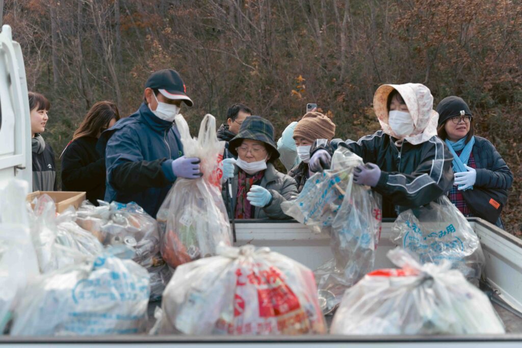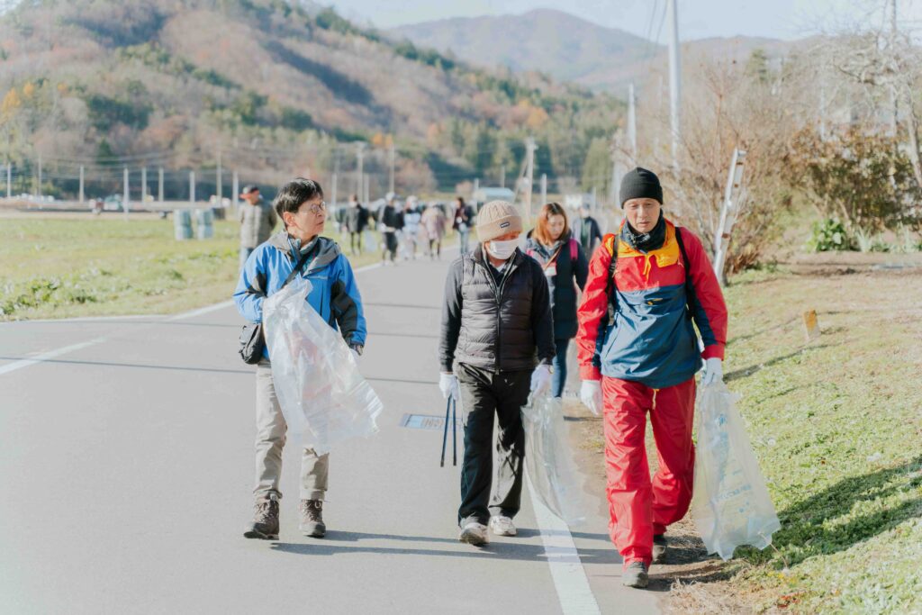 2日目最初の訪問先は関根・松塚行政区の集会所で、大勢の住民が出迎えてくれました。今日は地区総出で取り組む環境美化(ごみ拾い)の日。ツアー参加者も住民に混じって4つの班に分かれ、地区内を歩いて道ばたに落ちているごみを回収します。大半の場所は、みんなが意識してポイ捨てをしないせいかごみも少なく、用意した袋に入れるごみはわずか。国道沿いはそれなりの量が集まり、住民の皆さんと手分けしながら集めました。目前に広がるのはのどかな田園風景。景色も楽しみながら、地元の人ともいろいろ話す穏やかな散歩のひとときとなりました。