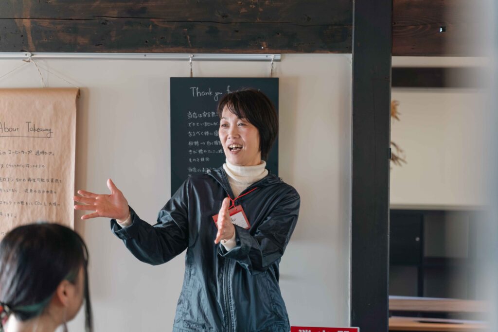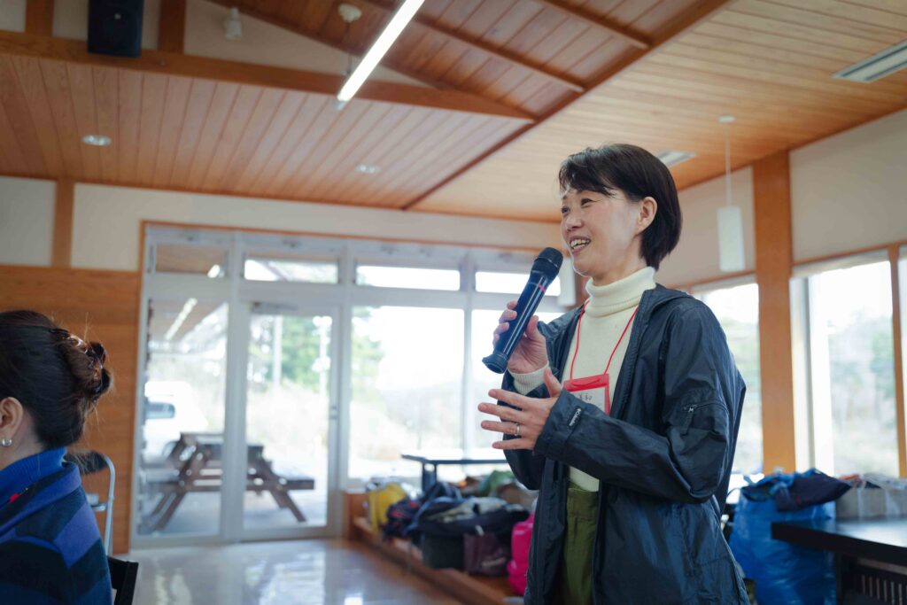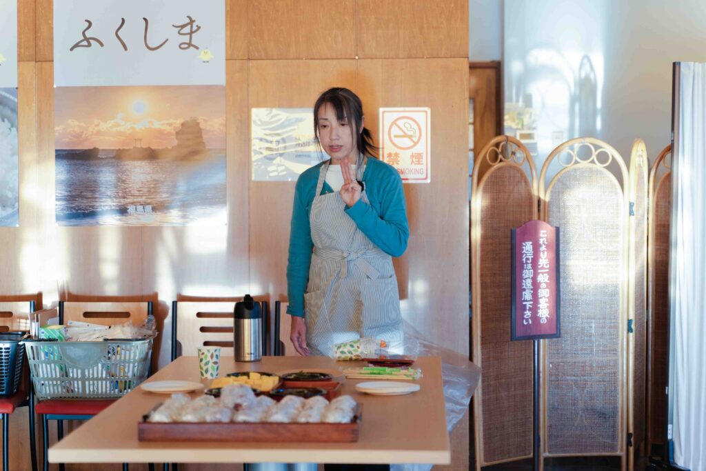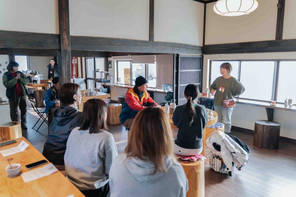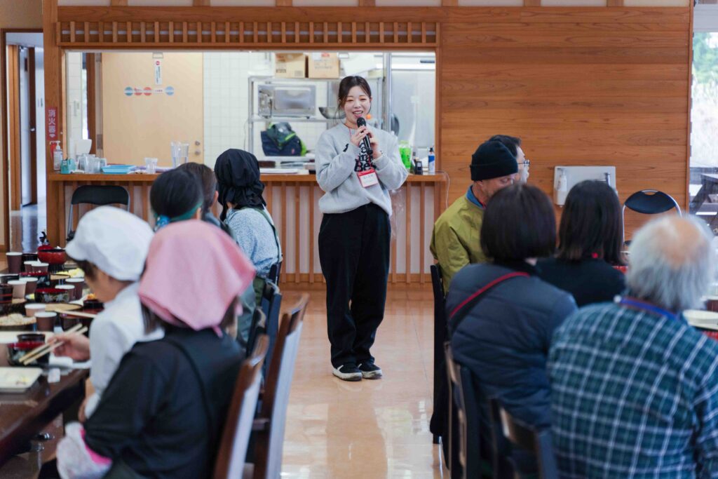 食事をとりながら、ツアーの運営スタッフが自己紹介しました。看護師と二足のわらじで手作りベーグルの店「村カフェ753(なごみ)」を営む田中久美子さんは「私も移住者。飯舘は何もないところだけど、その何もないところがとってもいいと思っています」と、村の魅力を語りました。