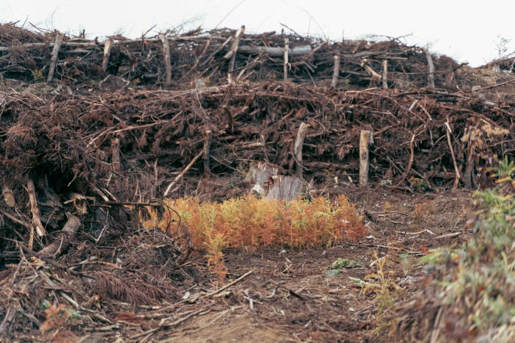 食事の後は飯舘村森林組合を訪ね、職員の案内で森林整備の現場へ。足元に気を付けながら急な斜面を登ると、樹木を伐採した切り株がたくさん並んでいて、その間には新しく植えた杉が数十センチの高さまで育っていました。いま注目されている、花粉の少ない品種だそうです。