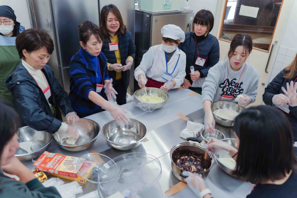 参加者を案内した食品加工室には、殺菌や冷凍などの衛生施設も完備。「ノウハウも含めサポートするので、興味のある方は是非ご利用ください」と、鮎川さんは呼びかけました。参加者も早速ビニールの手袋を着けて餅丸めに挑戦。丸めたお餅にはきなこやあんこをつけます。つきたての柔らかいお餅を時折頬張りながら、にぎやかに作業をしました。
