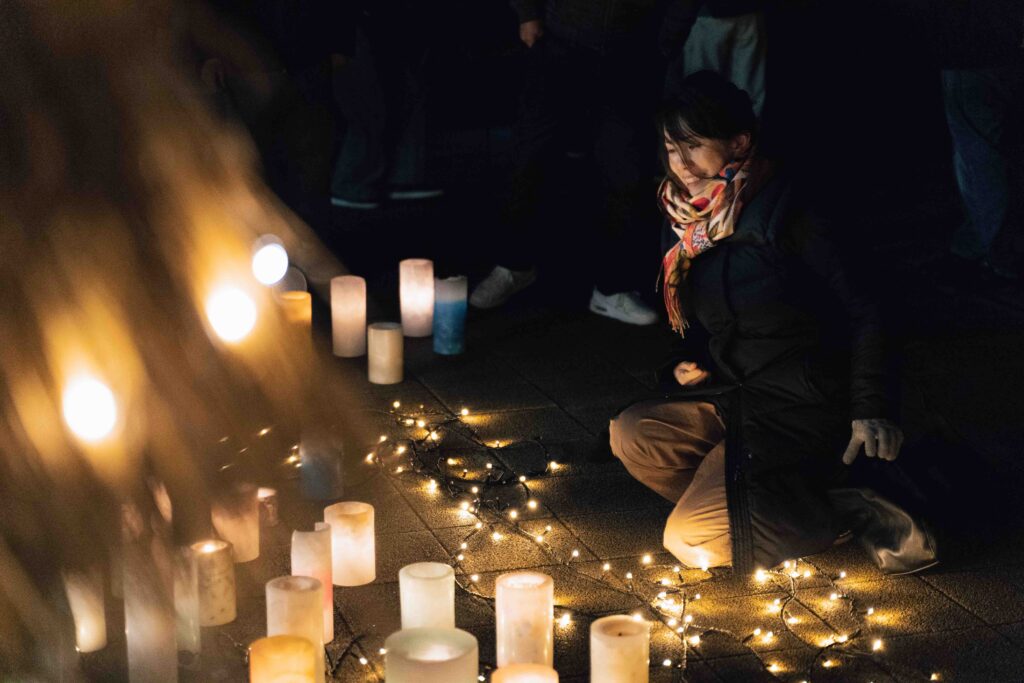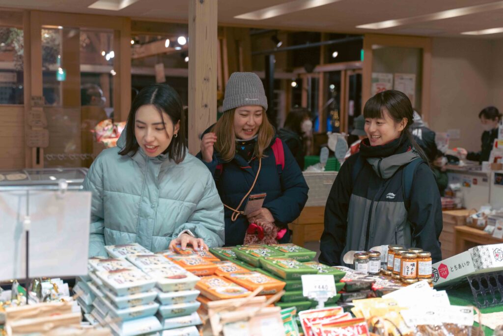 チェックインを済ませ、冬まつり開催中の「いいたて村の道の駅までい館」に到着。そのころには、すっかり日が暮れていました。参加者は夜空を彩る打ち上げ花火に歓声を上げ、色とりどりのイルミネーションや、さまざまな装飾を施したキャンドルが並ぶ幻想的な光景に見とれました。イベントに合わせ、特別に営業時間を延長して開店していた道の駅でも村産品の買い物を楽しみました。