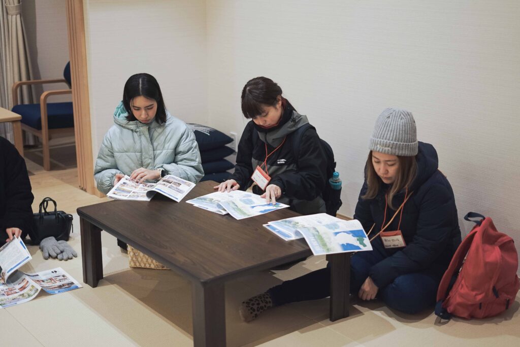 ツアースタッフからは、資料を見ながら改めて村の概要や農業の取り組み、震災前からの歩みについての説明がありました。飯舘村はかつて、若い既婚女性をヨーロッパへの研修旅行に送り出した「若妻の翼」や、他の市町村と合併せず「自分たちを輝かせる」独自の地域づくりに取り組んできました。原発事故による6年間の全村避難を経験し、まだないものも多いですが、それを「余白」と考えれば新しいチャレンジができる――そんな魅力を語りました。