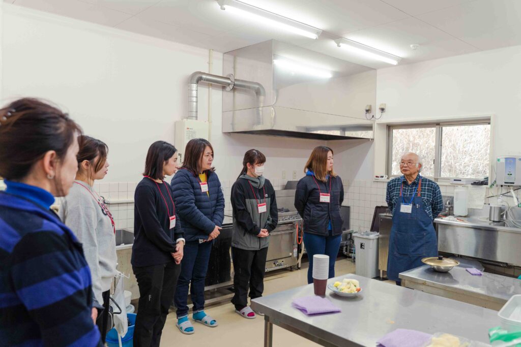 今夜の宿泊先『宿泊体験館きこり』は「あいの沢」の中に佇む宿泊施設です。そのとなりの『農業研修館きらり』は、2024年7月にオープン。農業体験の機会を提供し、新規就農者の確保につなげる狙いで作られた施設です。計5室に最大27人が長期宿泊もできます。ホテルのような宿泊室、会食にも使える研修室、自炊用キッチンなど充実した設備と格安の宿泊料金に、参加者から感嘆の声が上がりました。