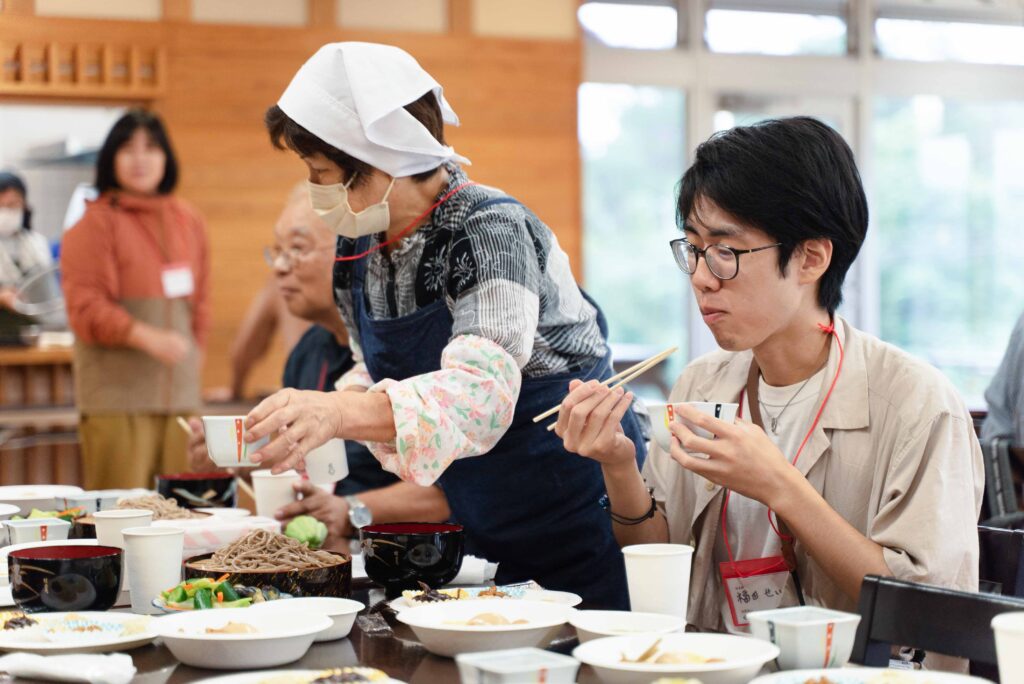さあ、お昼ご飯です。この日は村で作られたお野菜を中心に、協議会メンバーの松原光年さん、佐藤英信さんによる手打ちそばをはじめ、茄子やハヤトウリ、きゅうりのお漬物などの夏野菜。その他、秋の彼岸時期ということで、きな粉・納豆・餡子・じゅうねん(えごま)のお餅が並びました。