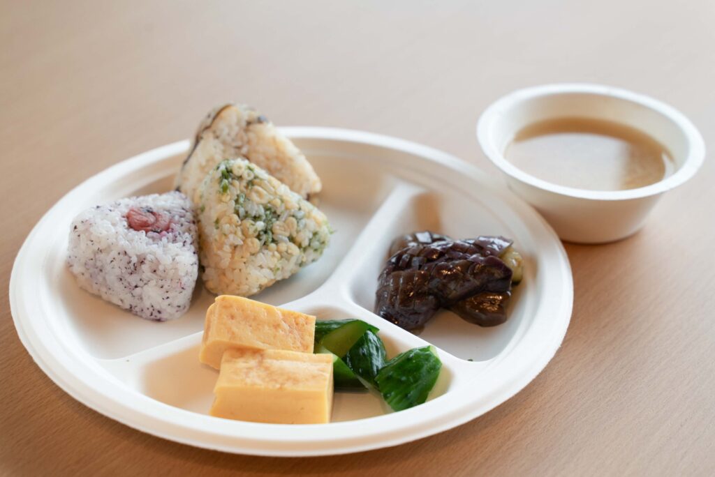 おにぎりはまさに農家の朝ごはんといった感じで「塩昆布とツナ」「ゆかりと梅干」「(天かすを使った)悪魔のおにぎり」の3種類。そこに玉子焼き、茄子の煮びたし、きゅうりの漬物と、このあと農園で収穫体験をする腹ごしらえとして、パワーをいただきました。