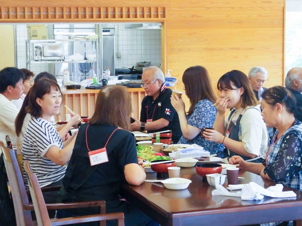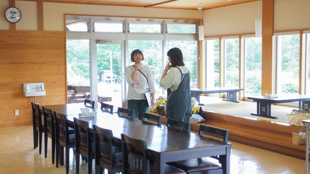 旅の行程は村の加工場施設『もりの駅まごころ』から。ここで福島駅集合メンバーと、車で直接来村するメンバーが合流し、ツアーが始まります。私(筆者)が到着した際には、まごころ運営協議会の村民のみなさんによって、昼食の支度が行われていました。