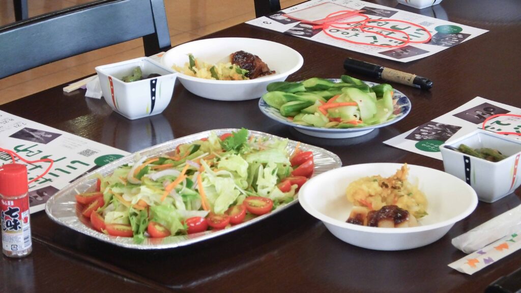 撮影後には、村の地域おこし協力隊員として『コーヒーポアハウス』を経営している横山梨沙さんお手製ビュッフェタイプのお昼ご飯を頂きました。横山さんは『コーヒー屋の食堂』として、普段和定食のランチ営業もしています。今回も村の野菜や食事を使用した献立をご用意頂きました。